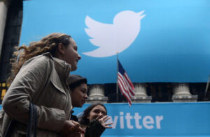 2013年11月7日,社交媒体推特公司在美国纽约证券交易所正式挂牌交易。图为行人从纽交所悬挂巨幅推特标志的大门前走过。 新华社记者王雷摄