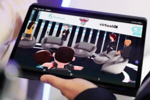 3月1日,一家西班牙展商在西班牙巴塞罗那2022世界移动通信大会上用平板电脑展示“元宇宙”中的会议室场景。新华社记者郑焕松摄