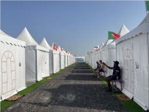 记者前往采访的时候,距世界杯揭幕战只有几个小时,入住的球迷并不多。帐篷区内空空荡荡,两位来自乌干达的房间服务员坐在两个帐篷之间的过道里,躲避大风;另一位来自肯尼亚的小哥用简单的中文和记者打招呼;小卖部的服务员翘首等待顾客的到来。