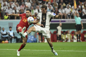 新华社多哈11月27日电(记者赵建通、肖世尧、王浩宇) 在27日的卡塔尔世界杯小组赛第二轮比赛中,德国队以1:1战平西班牙队。德国队主教练弗利克赛后表示,德国队踢出了很高水平的比赛,下一场对阵哥斯达黎加队要争取获胜然后晋级淘汰赛。