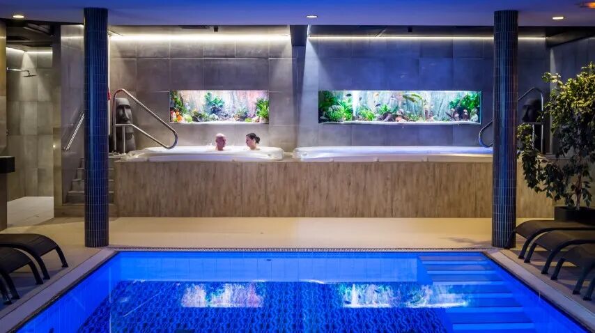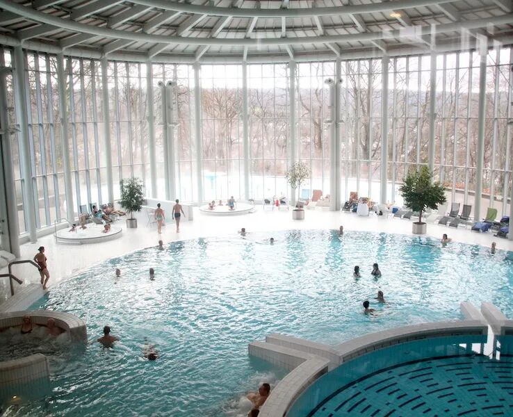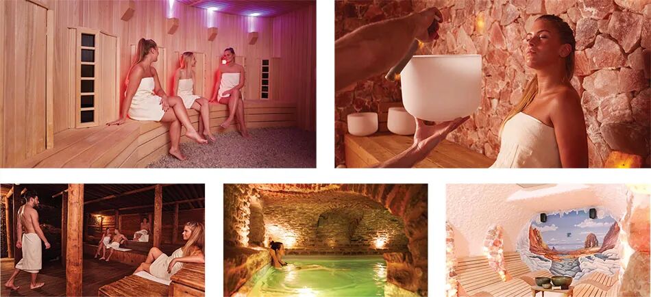 这里有两个气氛不同的区域。第一个区域是让顾客与同行的人一起享受温泉带来的福利。这一区域有蒸汽房、桑拿、天然游泳池,还有在瀑布下乘凉的机会。第二个区域专门用于个人时间,有盐水晶桑拿和室内外温水游泳池。裸浴温泉区内还有芬兰桑拿房,喷泉和室外游泳池……