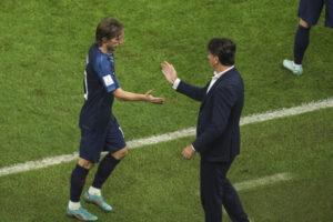 12月13日,克罗地亚队球员莫德里奇(左)在比赛中被替换下场后与主教练达利奇相互致意。新华社记者潘昱龙摄