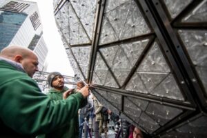 纽约时报广场降水晶球、倒计时迎新年的传统已有110多年历史。自1907年以来,除1942年和1943年,每年都会随着新年倒计时60秒从名为“时报广场一座”的大楼楼顶徐徐降下水晶球。水晶球上装有32256个LED灯,能变幻出璀璨夺目的图案,每年的图案都有一个主题。
