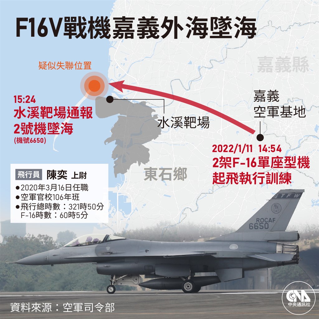台空軍嘉義基地一架F-16V單座戰機11日下午2時55分由飛行官陳奕上尉駕機執行例行性訓練任務時,光點於同日下午3時23分從雷達上消失,戰機事發在執行對地炸射科目、進行大角度導入時快速墜海,今天打撈到大量軍機殘骸,其中一塊印有國徽,但尚未發現陳奕下落。