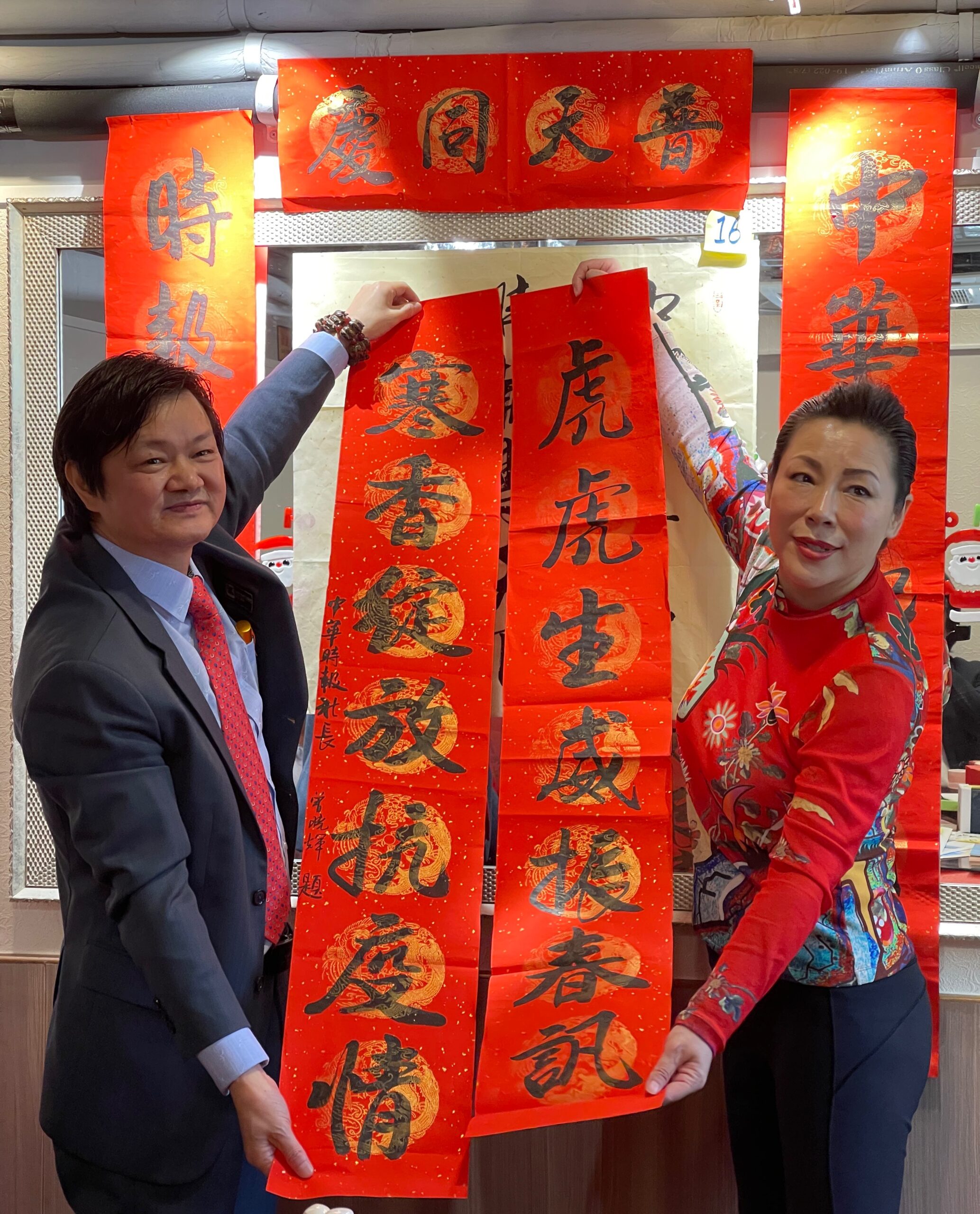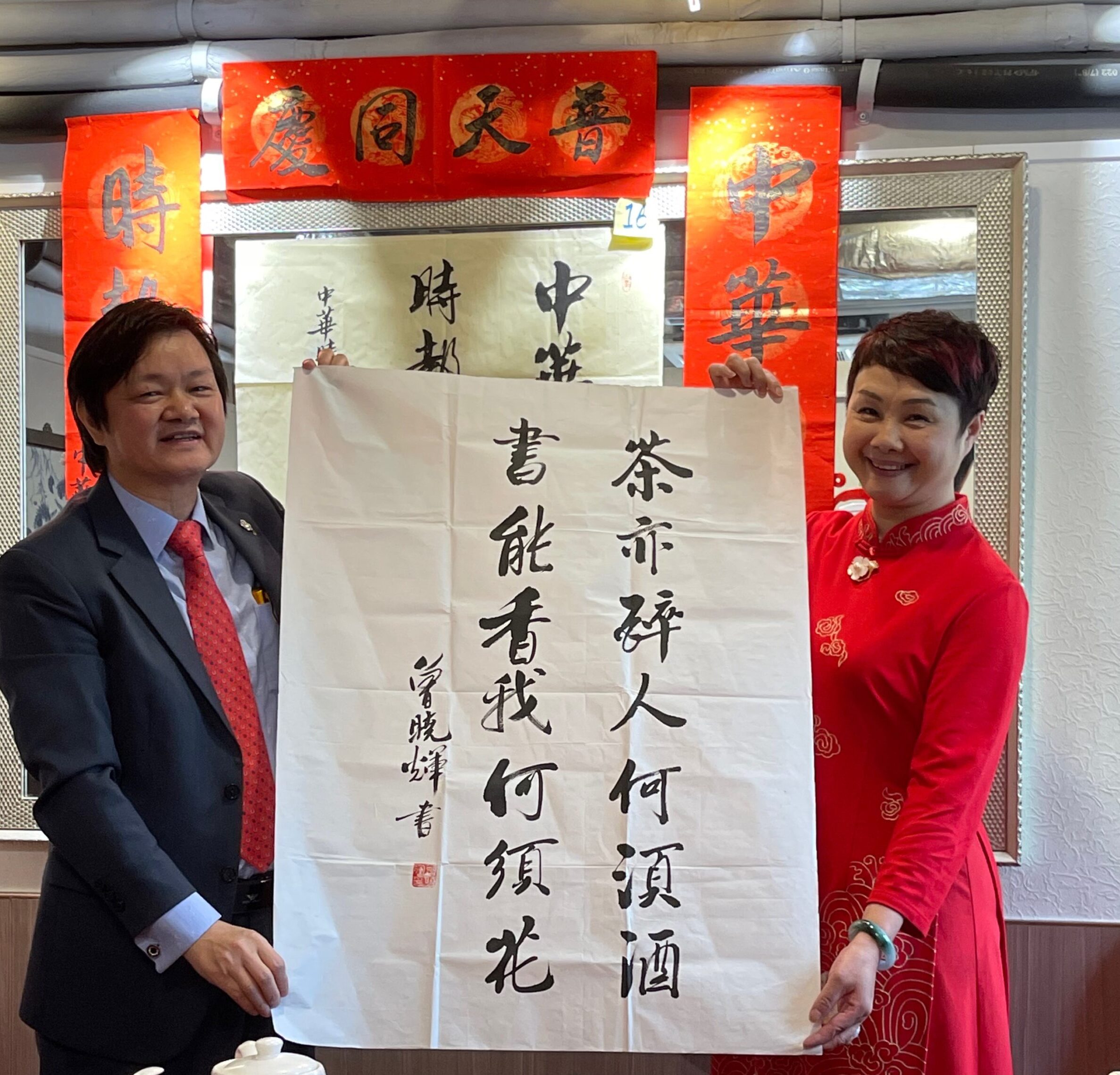 曾曉輝贈春聯給著名古箏演奏家鄒倫倫院士。