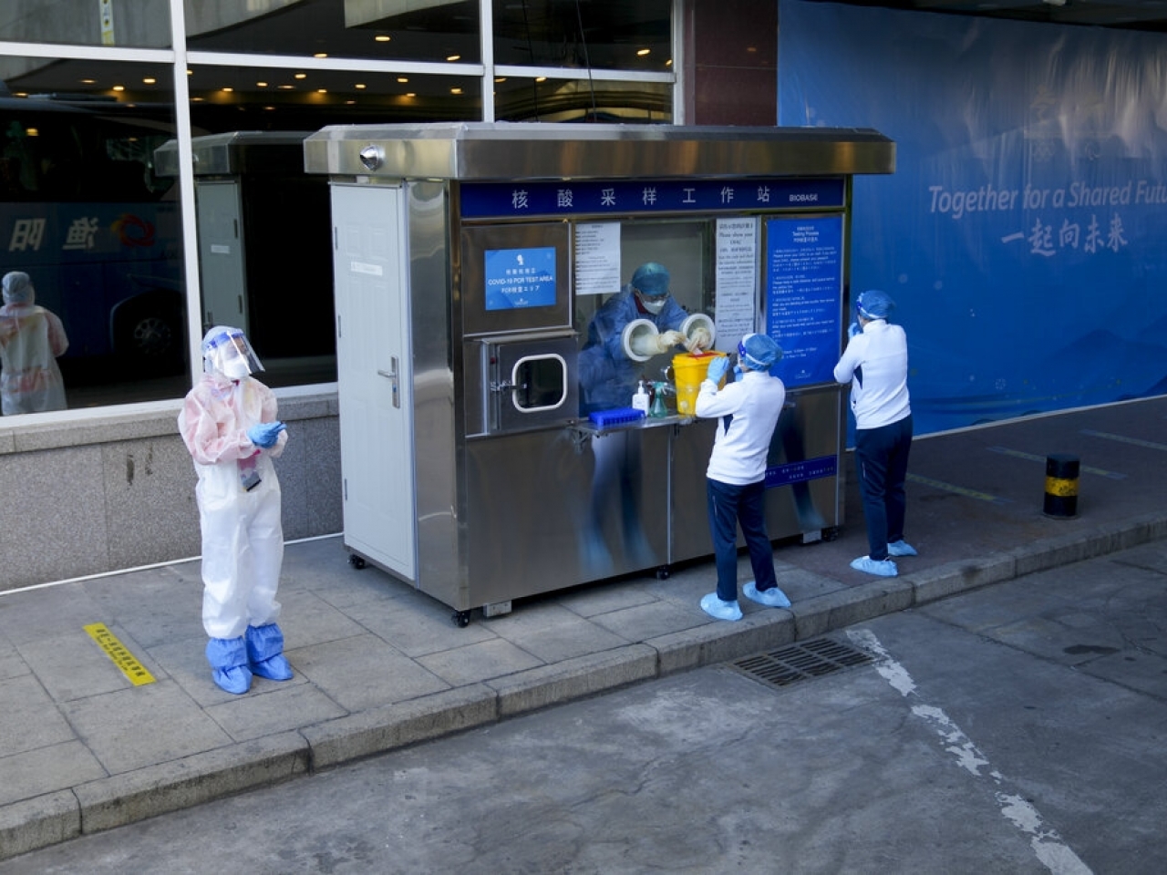 北京冬奧會工人進行核酸檢測。(美聯社資料圖片)