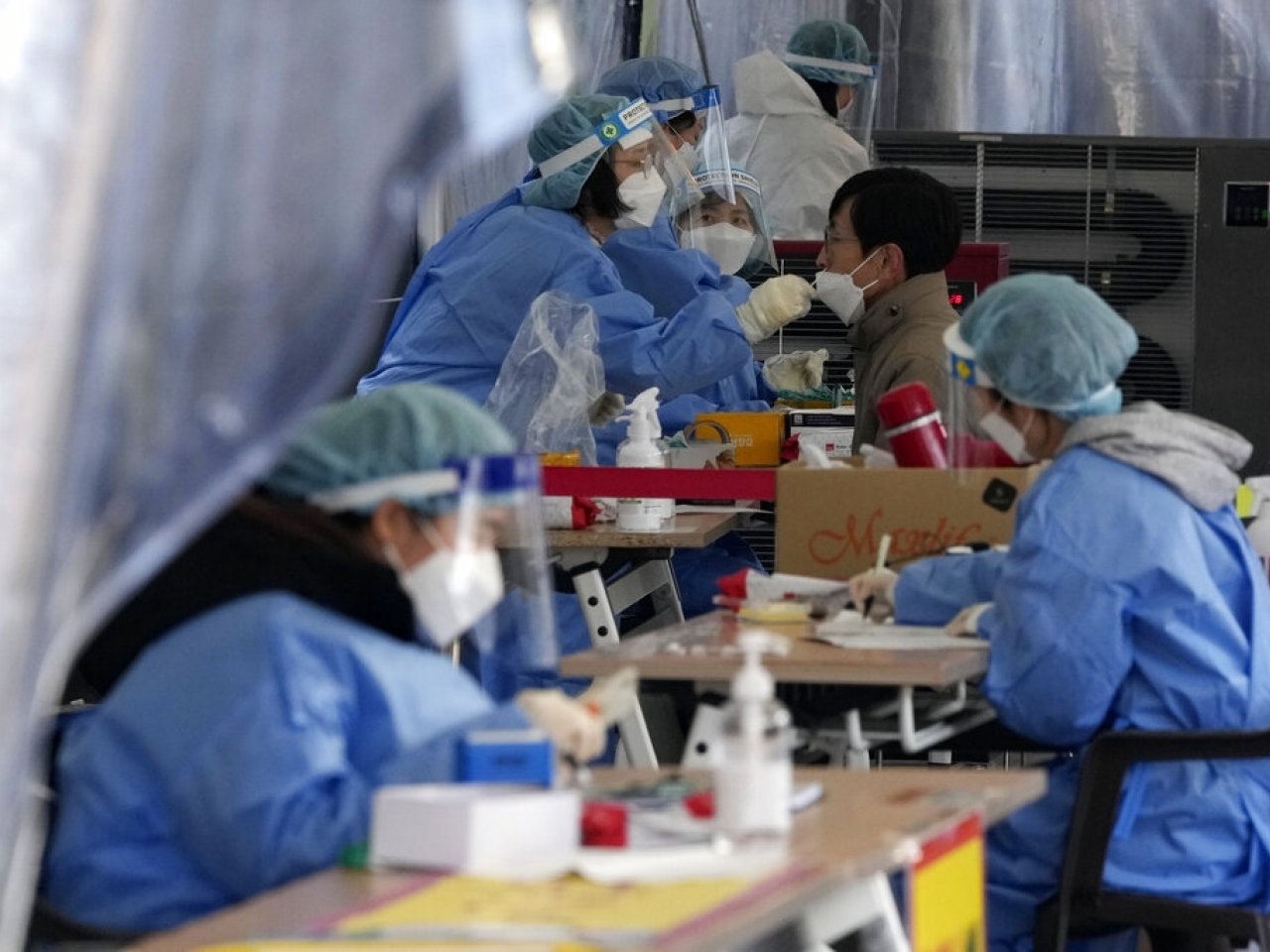 在首爾一個臨時檢測點,工作人員為一名男子採樣。(美聯社資料圖片)
