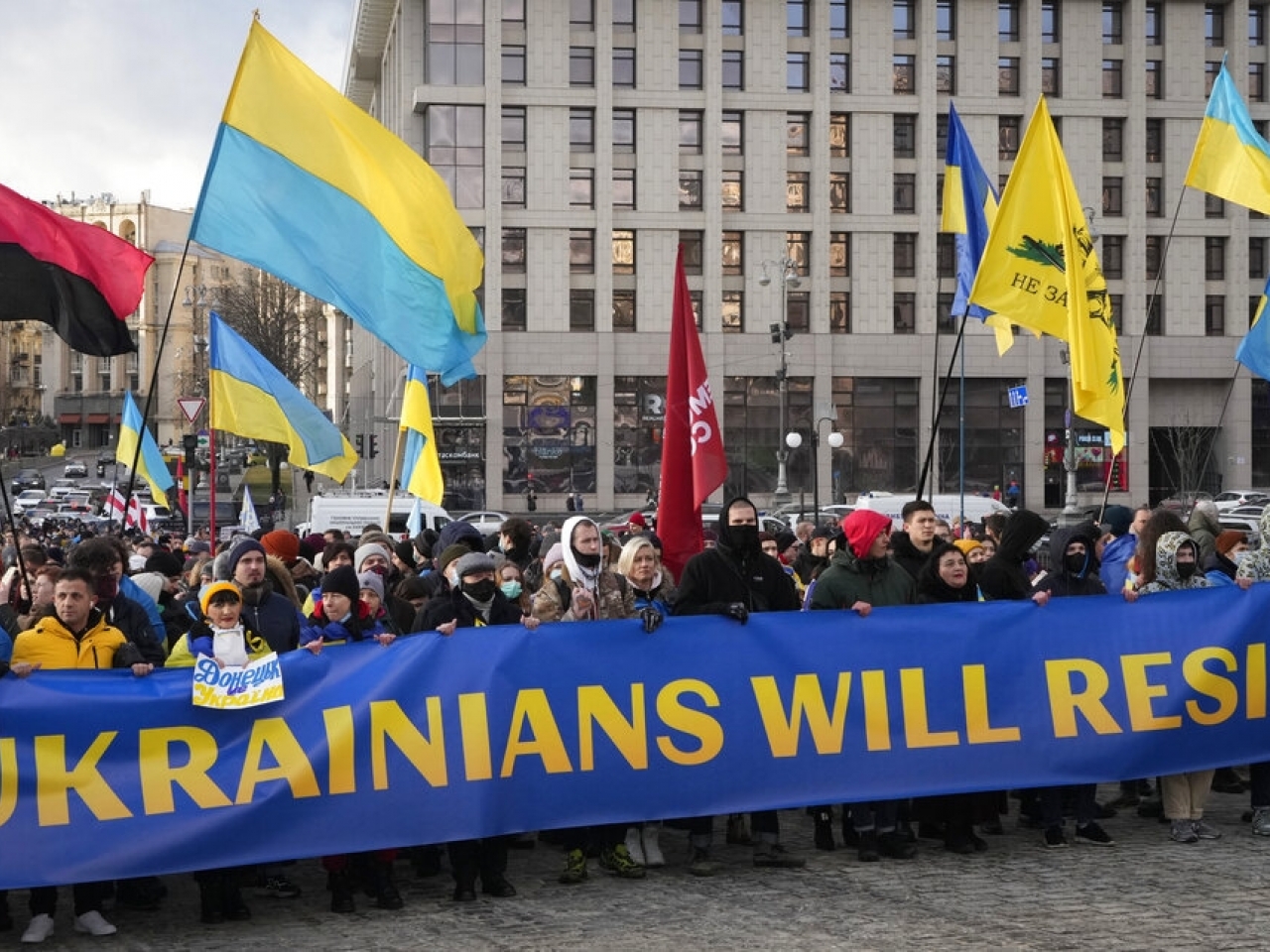 在基輔,幾千人拿著國旗遊行,又唱國歌,以示團結。