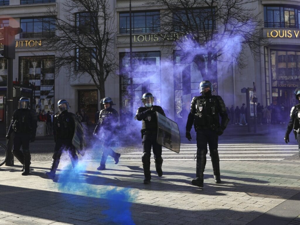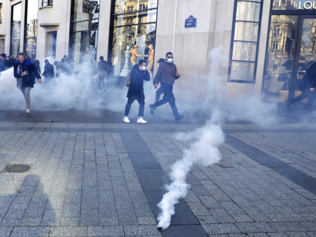 法國警方在巴黎香榭麗舍大道,施放催淚彈,驅散反對防疫措施的示威者,場面令人想起2018至19年的「黃背心」示威。