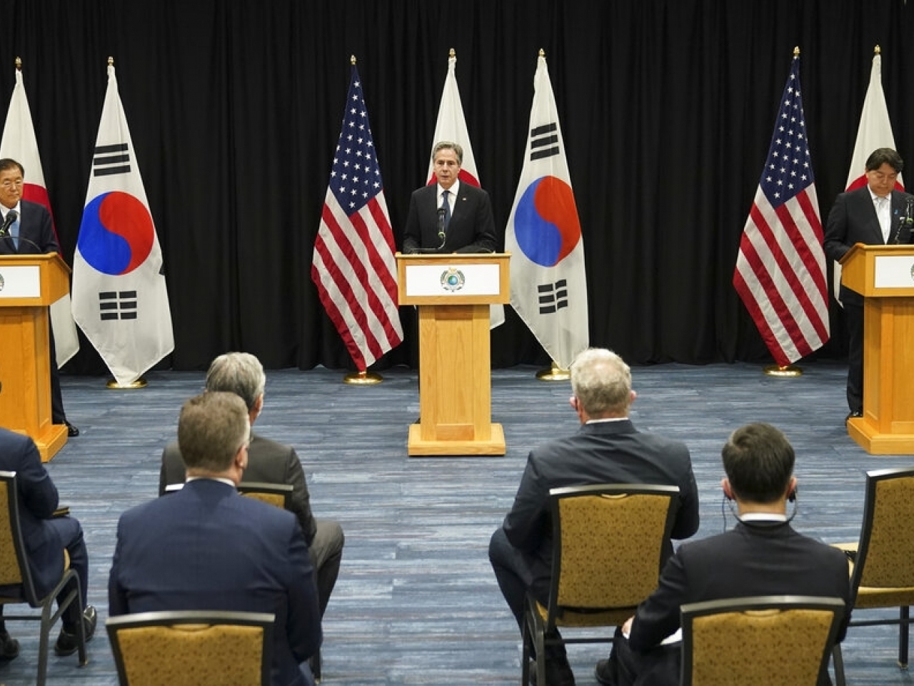 美國國務卿布林肯、日本外相林芳正及南韓外長鄭義溶在會後發表聯合聲明,譴責近期北韓接連發射彈道導彈進行武力示威,並表示這些行為引發局勢不穩,對此表示憂慮。