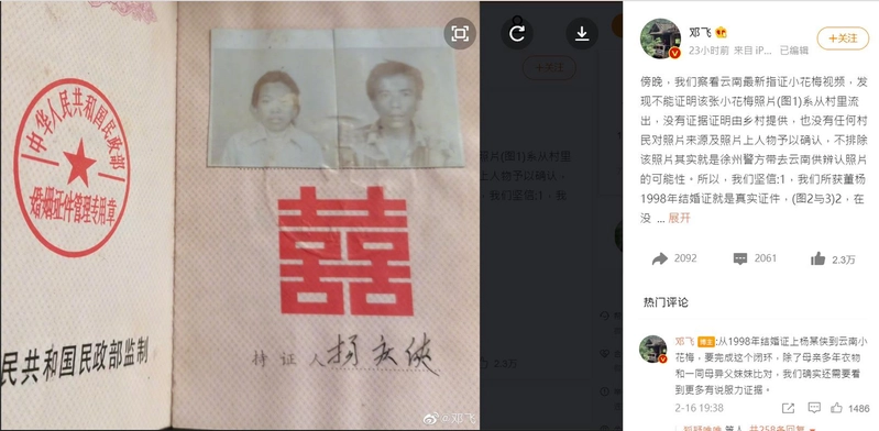 至於鄧飛公佈的結婚證,「除了沒有編號,讓老胡猶豫了一下,我是看不出有何破綻的…如果它是假的,那需要情報機構級別的專業操作。照片上的小花梅(楊某俠)與鐵鍊女是一人嗎?長相的確存疑。所以,相當詭譎。」