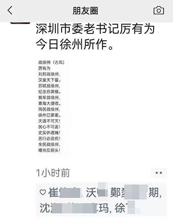 84歲的厲有為在1993年至98年擔任深圳市委書記,銳意改革。網傳他在微信朋友圈發布《戰徐州》一詩:「劉邦戰徐州,漢室天下留。蘇軾戰徐州,紀念蘇黃樓。我軍戰徐州,淮海大捷收。網民戰徐州,徐州已蒙羞。天道不可滅!民心不可丟!史實休遮掩!惡行必追究!全民戰徐州,曙光在前頭!」