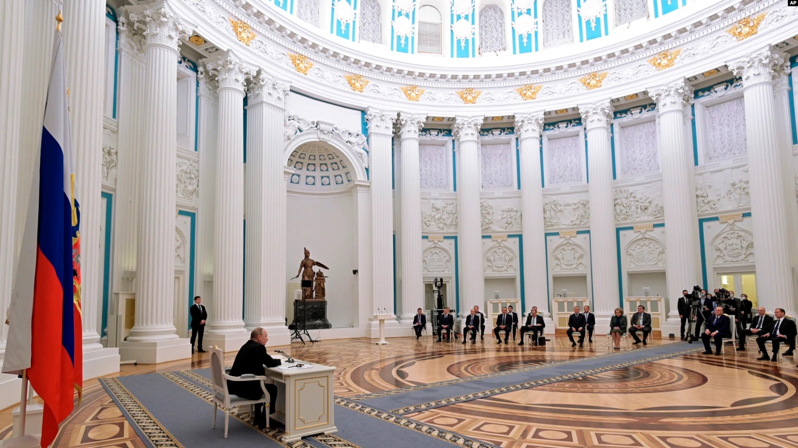 普京星期一從克里姆林宮的一張桌子上對俄羅斯人民發表了近一個小時的電視講話,勾畫了他有關歐洲歷史國界和1990年代蘇聯解體的解讀版本。
