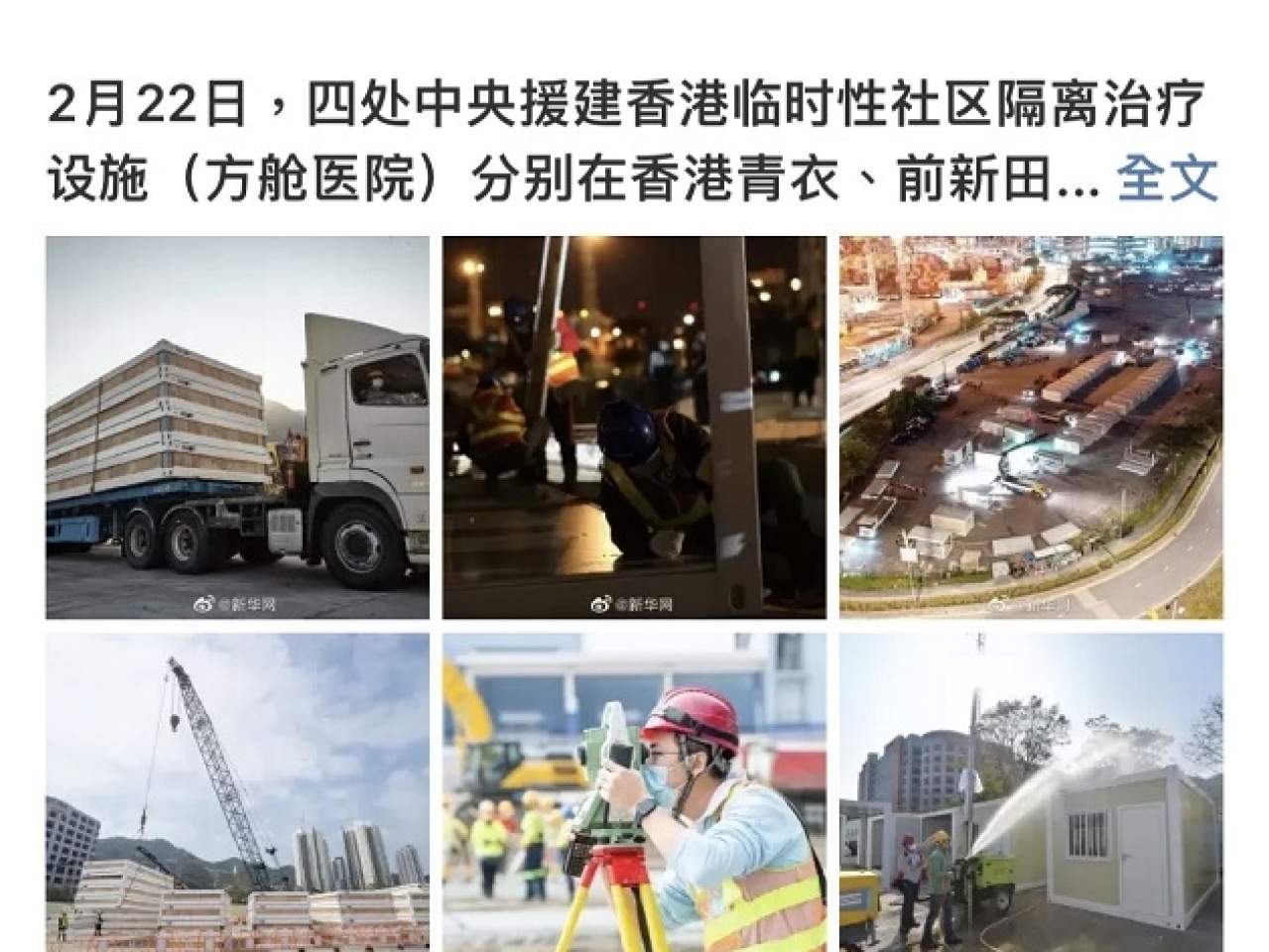 中央援建項目之一青衣方艙醫院預計今天交付。(微博截圖)