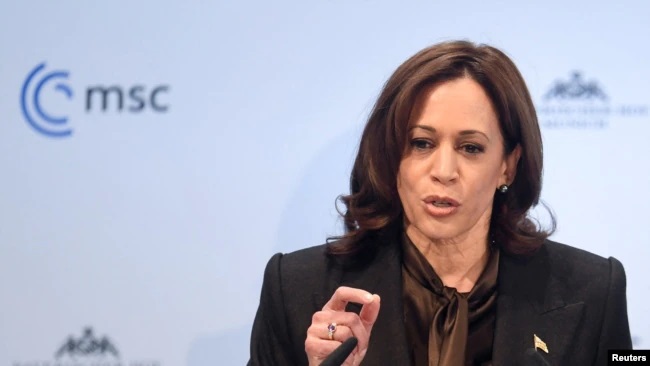 資料圖:美國副總統哈里斯在慕尼黑安全會議上發言。(2022年2月19日)