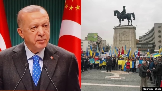 圖左為土耳其總統埃爾多安(Recep Tayyip Erdogan);圖右:土耳其民眾上街抗議俄羅斯入侵烏克蘭。