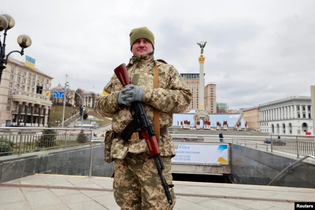 烏克蘭軍人守衛基輔市中心的獨立廣場。