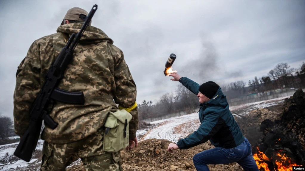 一名乌克兰平民正在训练用自制燃烧瓶(莫洛托夫燃烧弹)保卫自己的家园日托米尔市。3月1号,俄军继续向日托米尔市逼近。