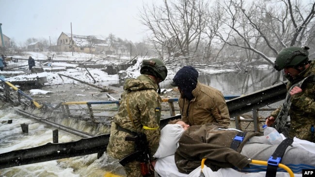 烏克蘭軍人在基輔西北城鎮伊爾平轉移平民期間抬著一名受傷的婦女。(2022年3月8日)
