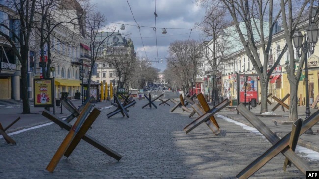 資料照片:烏克蘭敖德薩街頭的反坦克路障。(2022年3月13日)