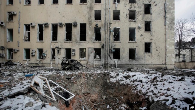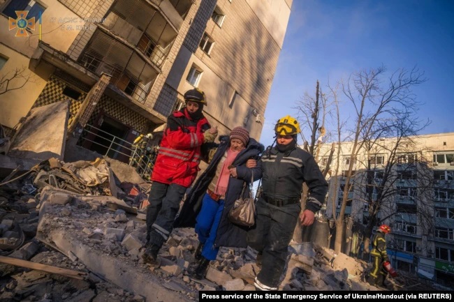 烏克蘭首都基輔繼續遭到俄軍的攻擊。星期四清晨5點,俄軍一枚導彈在基輔上空被攔截後墜落在一棟16層住宅樓上,當局說,至少一人死亡,多人受傷,幾十人被送到安全地帶。