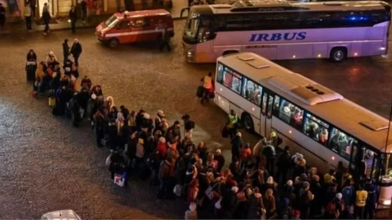 周三,在波蘭的烏克蘭難民排隊等候轉運到其他地區