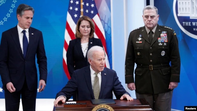 拜登總統在國務卿布林肯、國防部副部長希克斯和參聯會主席米利將軍的陪同下談美國對烏克蘭的援助。(2022年3月16日)