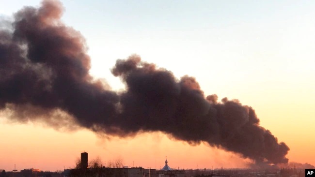 - 從機場方向可以看到烏克蘭西部城市利沃夫上空升起的大片煙霧