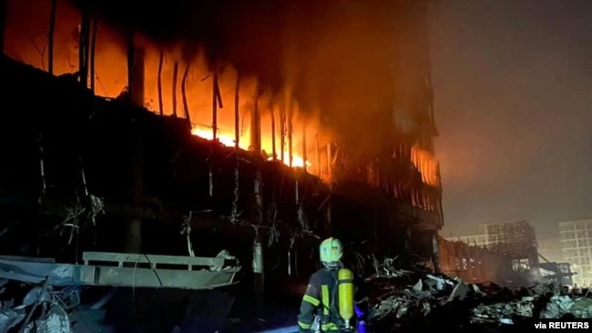 - 烏克蘭首都基輔(Kyiv)一處購物與住宅區星期天(20日)深夜遭受猛烈炮轟,應急部門徹夜搜救,目前已知至少四人死亡。市長維塔利·克里琴科(Vitali Klitschko)表示,炮彈擊中購物商場與數間房屋,引發大火。