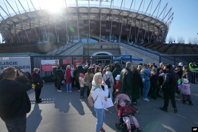 華沙的國家體育場已經被臨時改用作烏克蘭難民登記處,而等待登記的烏克蘭難民已經連續第三天在這里大排長龍。