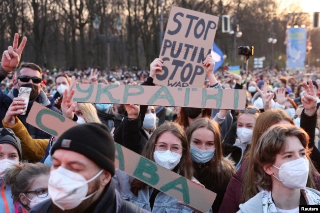 柏林警方星期天(3月20日)表示,大約有兩萬人出席了當天在柏林市中心勃蘭登堡門前舉行的反戰音樂會,與會者揮舞著烏克蘭國旗和反對俄羅斯入侵烏克蘭的標語牌。