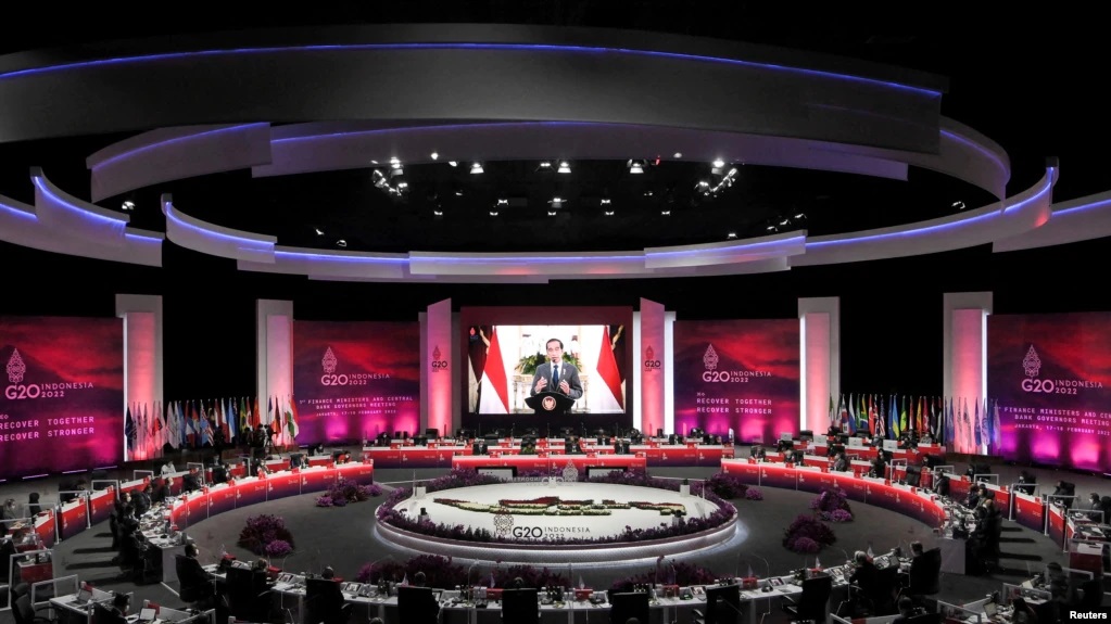 印度尼西亞總統佐科·維多多在雅加達會議中心舉行的20國集團財長和央行行長會議(FMCBG)上,通過視頻發表講話。(2022年2月17日)