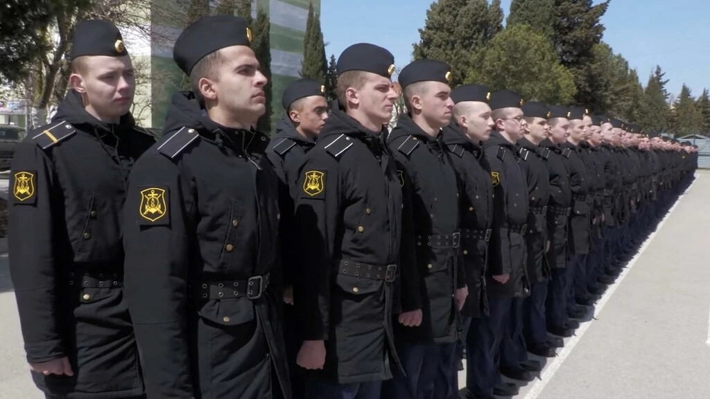 在2022年4月16日發布的視頻中,來自沉沒的導彈巡洋艦莫斯科號倖存的船員排隊等候與俄羅斯海軍首腦尼古拉-葉夫曼諾夫上將會面。 via REUTERS – RUSSIAN DEFENCE MINISTRY