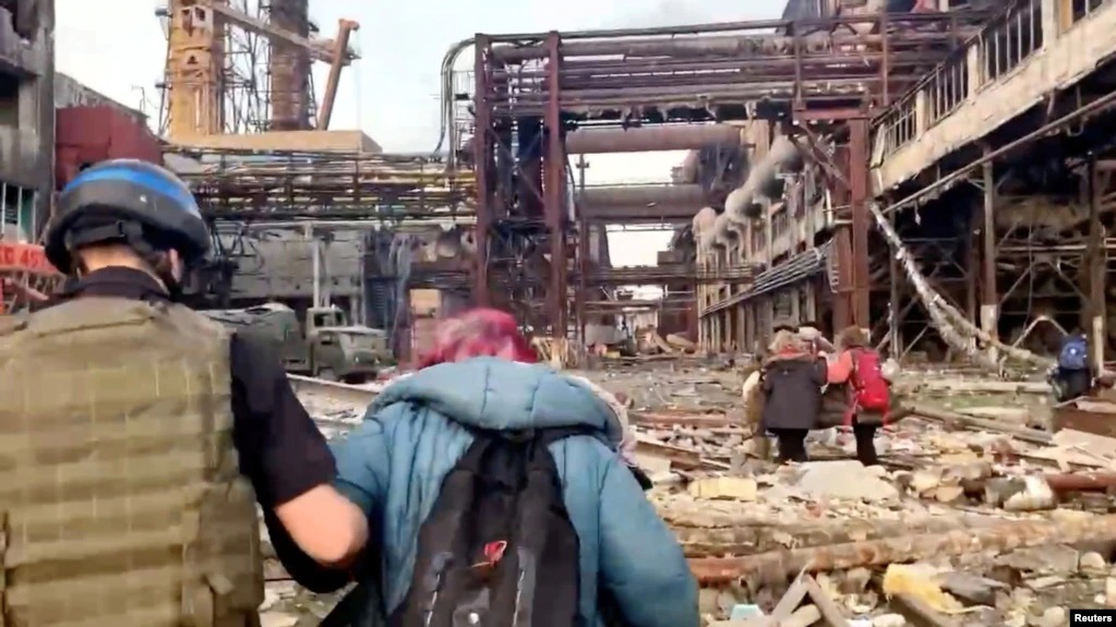 被圍困在馬里烏波爾市亞速鋼鐵廠的平民2022年5月1日在聯合國牽頭組織的行動中撤離。(路透社轉發)
