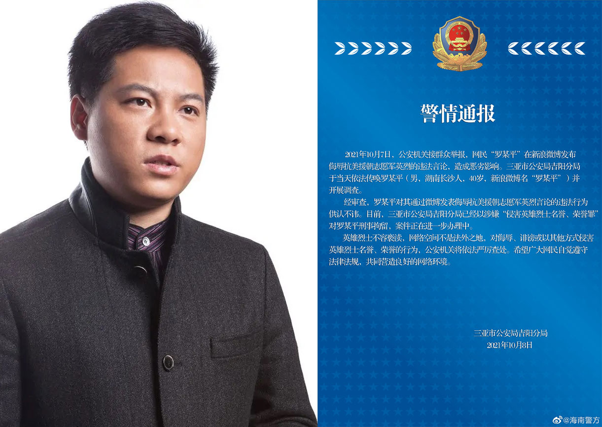 中國媒體人羅昌平因發文批評愛國電影《長津湖》,被指言論內容侮辱韓戰中戰死的中國士兵,被控”侮辱英烈名譽”罪名,在海南三亞法院一審判決,入獄七個月,並需公開道歉。熟悉中國法律的學者表示,當局想借羅昌平案殺雞儆猴,此例一開,將來可能有更多人因言論被拘捕。有中國維權律師指出,若侮辱國民黨抗日戰士必不會被定罪。