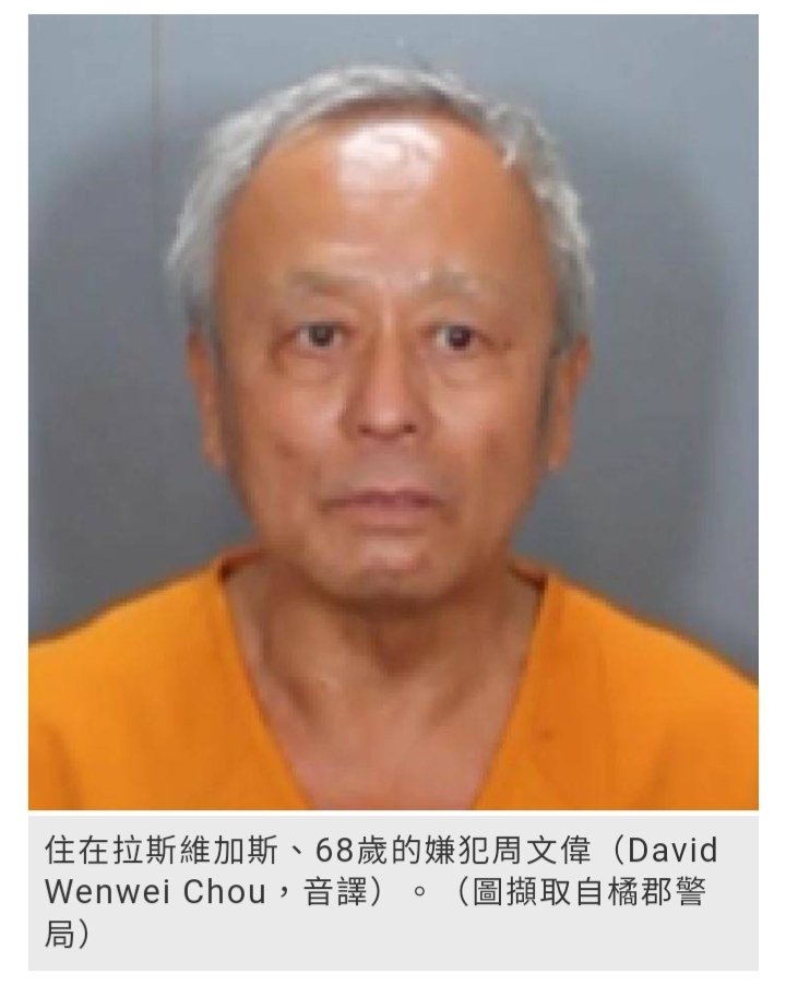 5月15日,美国加州橙县的拉古纳伍兹(Laguna Woods)市的一所教堂发生枪击事件,导致1人当场死亡、5人受伤,这6人都是来自台湾的侨民。这起枪击案枪手是来自内华达州拉斯维加斯的68岁周文伟(David Wenwei Chou),他被控一项谋杀罪和5项杀人未遂罪,设定保释金为100万美元。