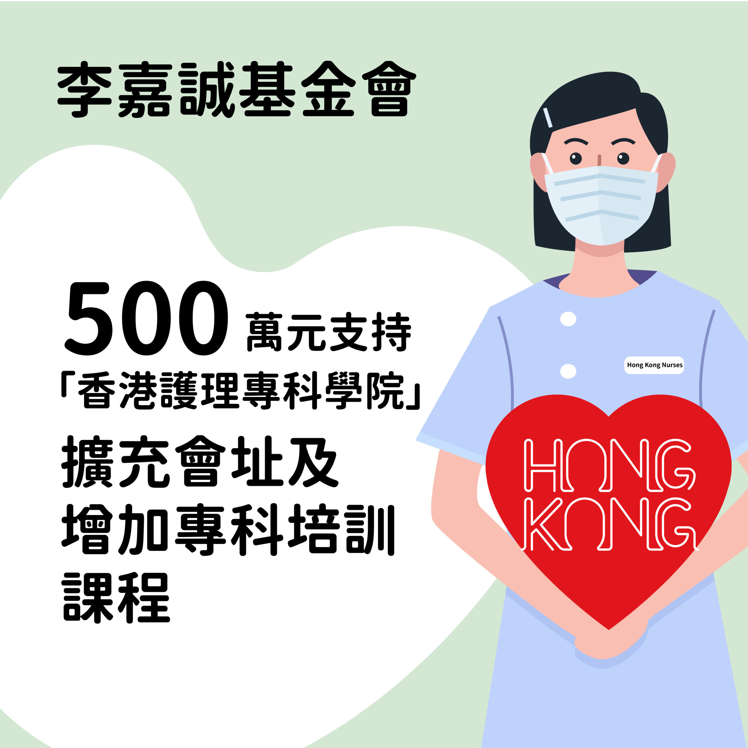 2022年5月23日,李嘉誠基金會宣布向「香港護理專科學院」(護專)捐資500萬港元無特定項目款項,支持其擴充會址及進一步提供專科培訓課程所需,確保全港護士會員得到持續專業提升的支援。李先生認為,護士對社會的貢獻,對每一市民都是不可量算的:「能夠支持香港護士,我深感榮幸,她們體諒病患的智慧和善良的心力,為我們的健康和福祉帶來實質正向改變。」