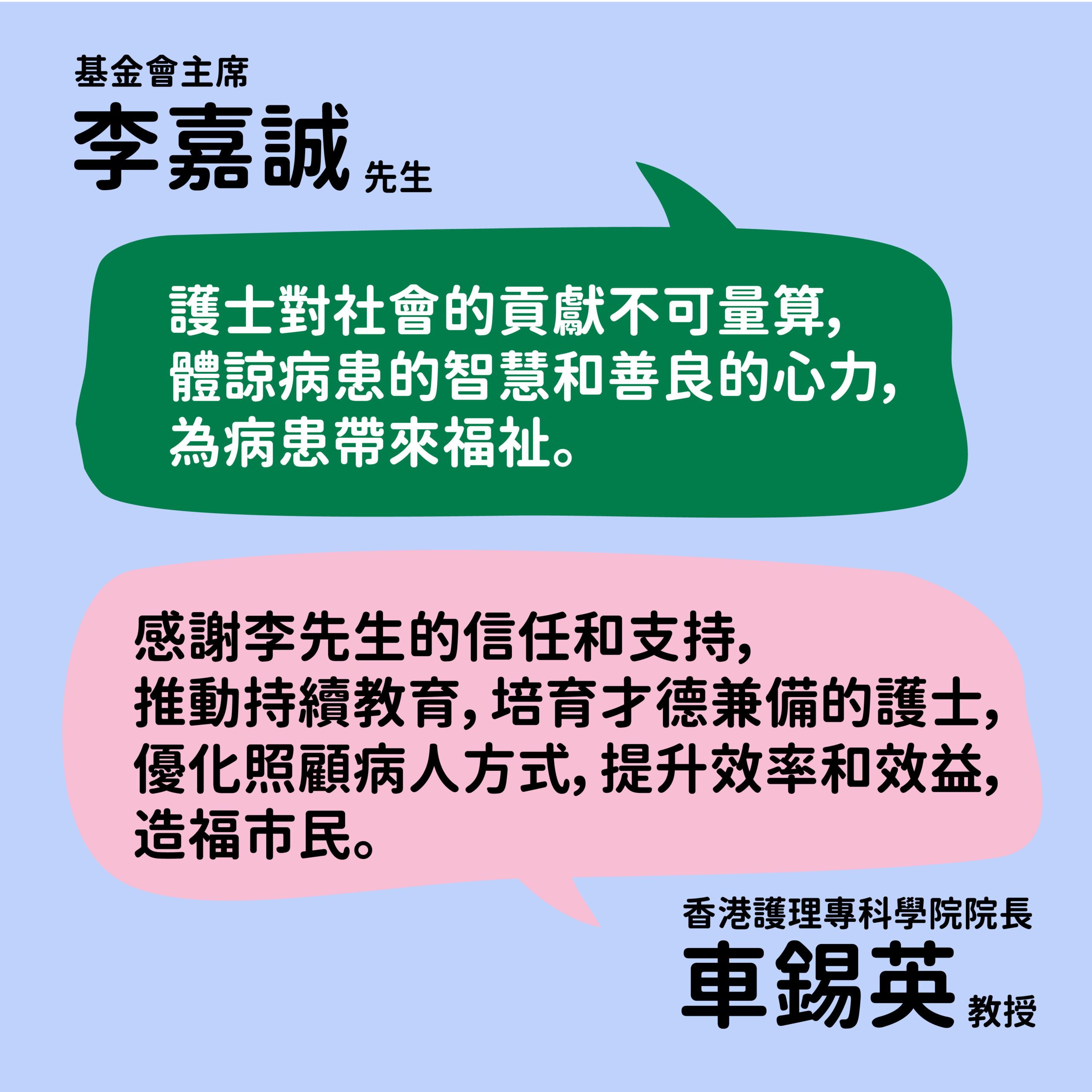 香港護理專科學院院長車錫英教授衷心感謝李先生對護專的信任和支持, 護專連同轄下14個分科學院將繼續同心竭力推動專科護理持續教育,為本港培育更多才德並備的優秀專科護士,並持續優化病人照顧模式,務求造福更多市民,以及進一步提升香港醫療體系的效率和效益。