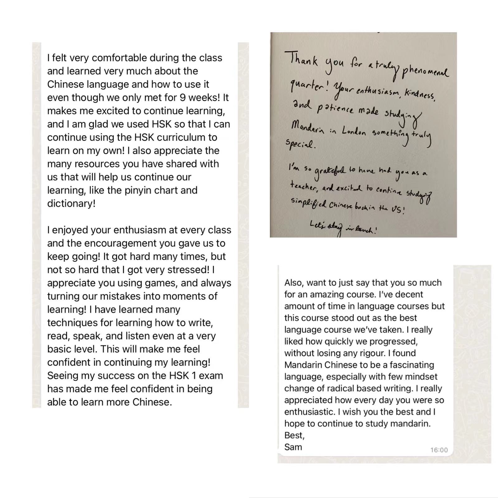 芝加哥大学该项目负责人Lauren在邮件中说,“与文麟合作是一个非常积极和顺利的过程。我很高兴我们能够一起为我们的学生提供中文辅导课程!从开始到结束,文麟团队每个人都对我们的需求给予了很大的帮助和及时的响应。我真的很感谢大家对课程的精心准备。很高兴我们的高年级学生能够获得对其水平的评估,从而使课程能够紧密地适应她的水平,并且我们的初学学生在HSK1中有了非常明确的学习目标。我很欣赏这些根据学生的具体需求编写的教学大纲。我也很高兴朱老师能够在我们伦敦校区为我们的学生提供的课程。据我所知,到目前为止,学生们在这学期学习中文的经历非常棒!我仍在评估秋季的需求,如果我们有更多的学生对学习中文感兴趣,我将非常高兴再次与文麟合作!”