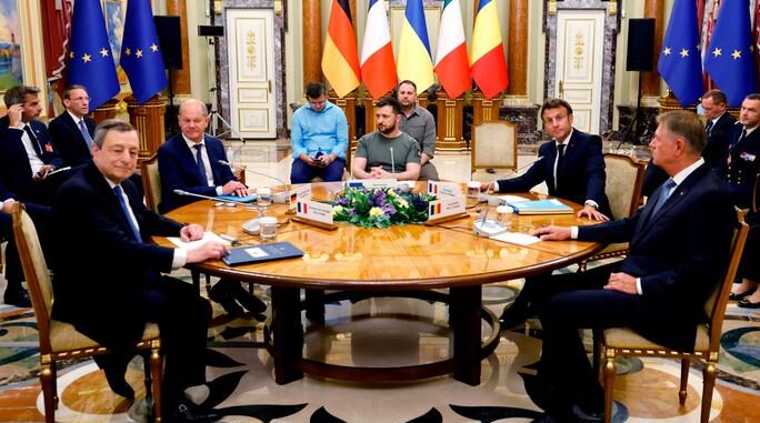 俄國2月24日入侵烏克蘭後,法國總統馬克龍(Emmanuel Macron)、德國總理朔爾茨(Olaf Scholz)、意大利總理德拉吉(Mario Draghi)、羅馬尼亞總統約翰尼斯(Klaus Iohannis)首度一起造訪烏克蘭首都基輔(Kyiv)。