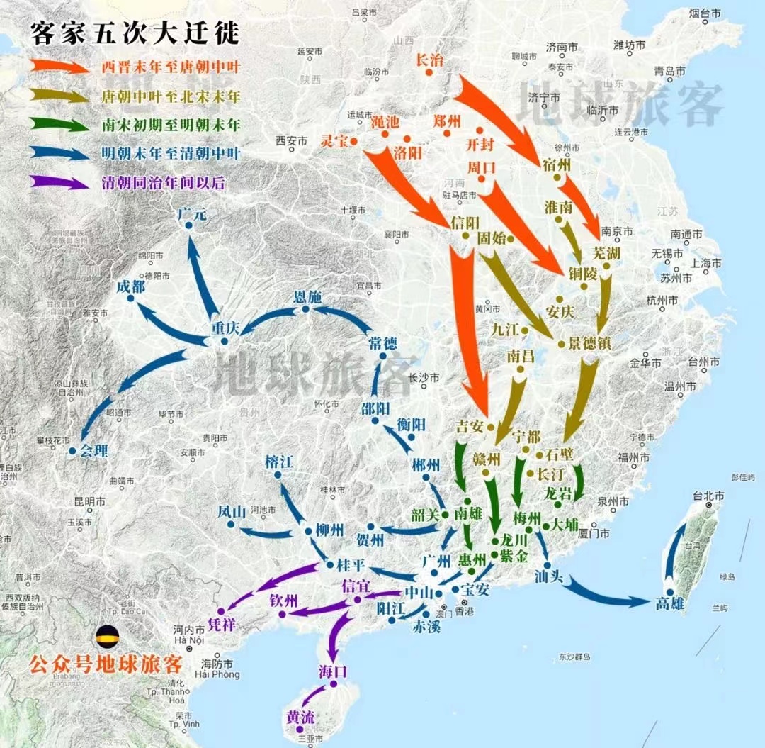客家人的遷徙歷史,可上溯至西晉末年。前後五次大規模的遷徙(永嘉之亂、黃巢之亂、靖康之變、南明危局、太平天國),歷時一千五百年。