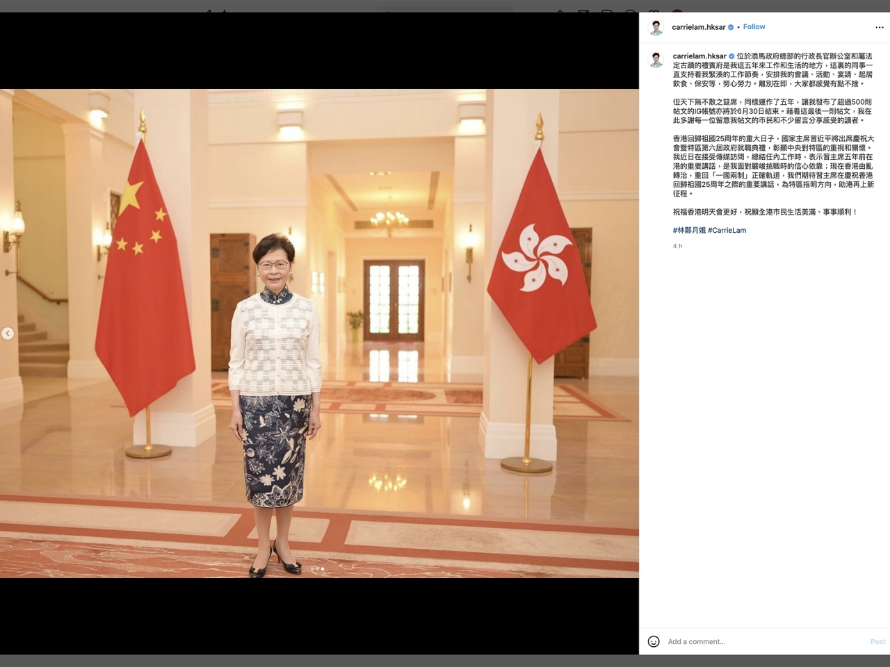 彭博社記者問林鄭月娥是否會為她任內發生的一系列事情向香港人道歉,林鄭月娥回應說:“不會。我想向我的丈夫和兒子們道歉,因為他們為支持我為香港人服務的使命以及把香港建設成為中華人民共和國的一部分而做出了犧牲。”有分析指,林正月娥說這話,或許她在想,我只是在忠實地執行習主席的命令?