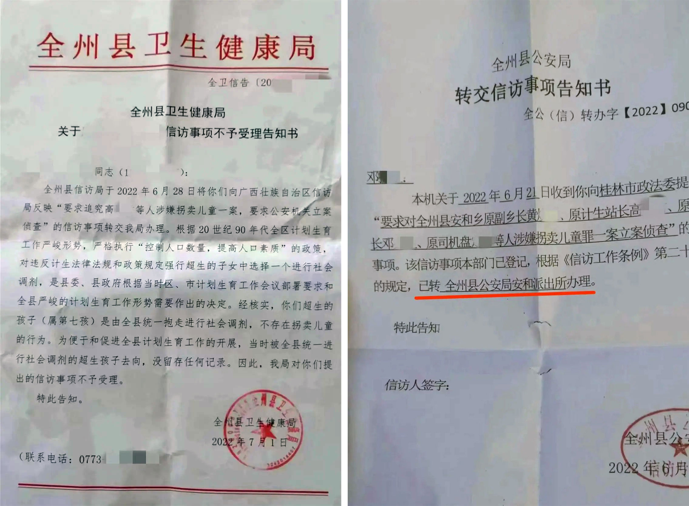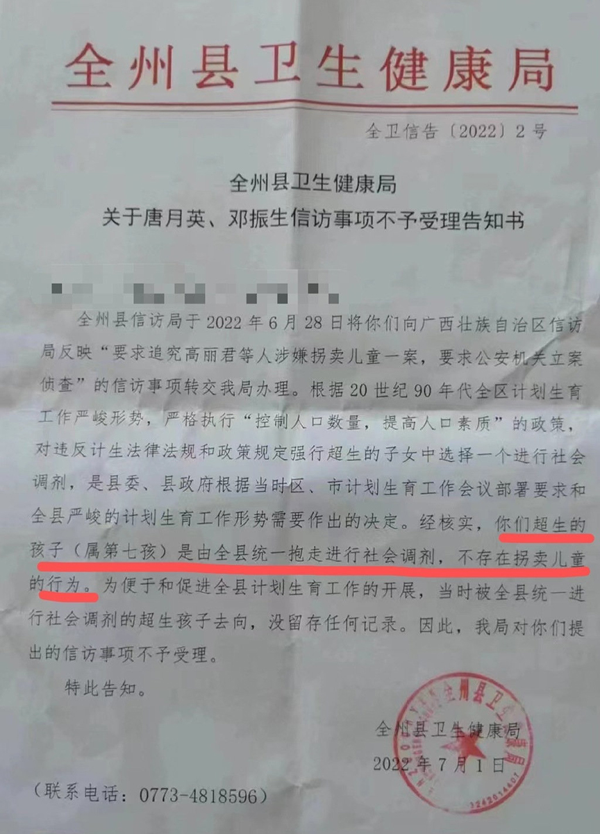 唐月英和鄧振生夫婦在孩子被拐賣後,苦尋32年但無結果,兩人到當地政府信訪部門,針對孩子被拐賣一事請求立案偵查。7月5日,互聯網上流傳一份來自廣州全州縣衛生健康局文件發佈《信訪事項不予受理告知書》,內容指出,這對夫婦被抱走的孩子屬於超生第七孩,當年由全縣統一抱走進行“社會調劑”,不存在拐賣兒童的行爲。文件更稱“被全縣統一進行社會調劑的超生孩子去向,沒留存任何紀錄”,對於信訪事項不予處理。