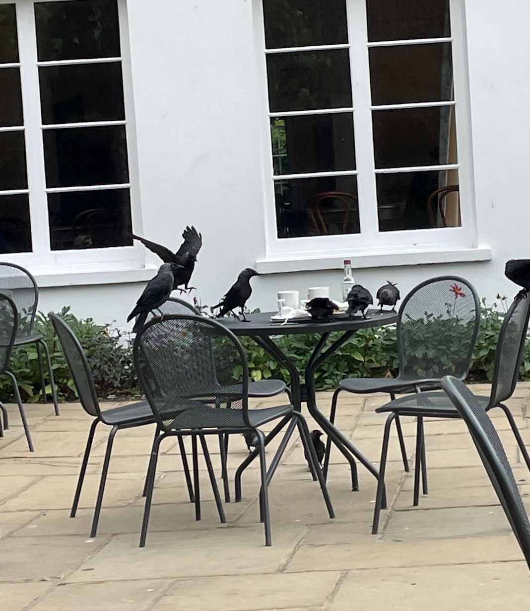你在喝下午茶,旁边就有鸟儿围着,待你起身,它们就群起而至,品味残留的蛋糕,饮着没喝完的咖啡。放着没用的糖包,都会被叼起拖走。它们早就驾轻就熟,知道什么有用。