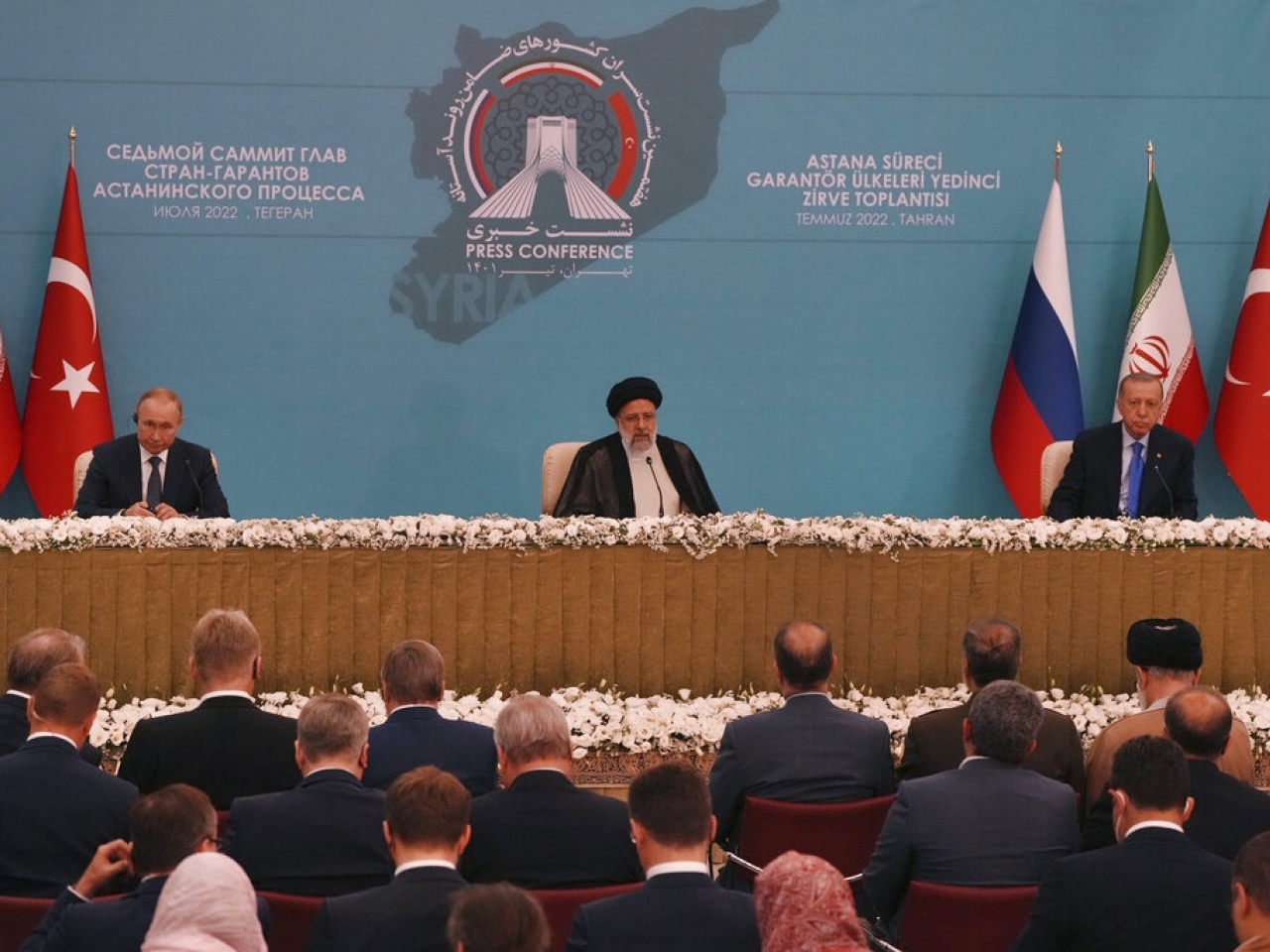(中華新聞通訊社/中華時報7月20日訊)到訪伊朗的俄羅斯總統普京和土耳其總統埃爾多安,與伊朗總統萊希舉行三方會談,討論解決敘利亞問題。