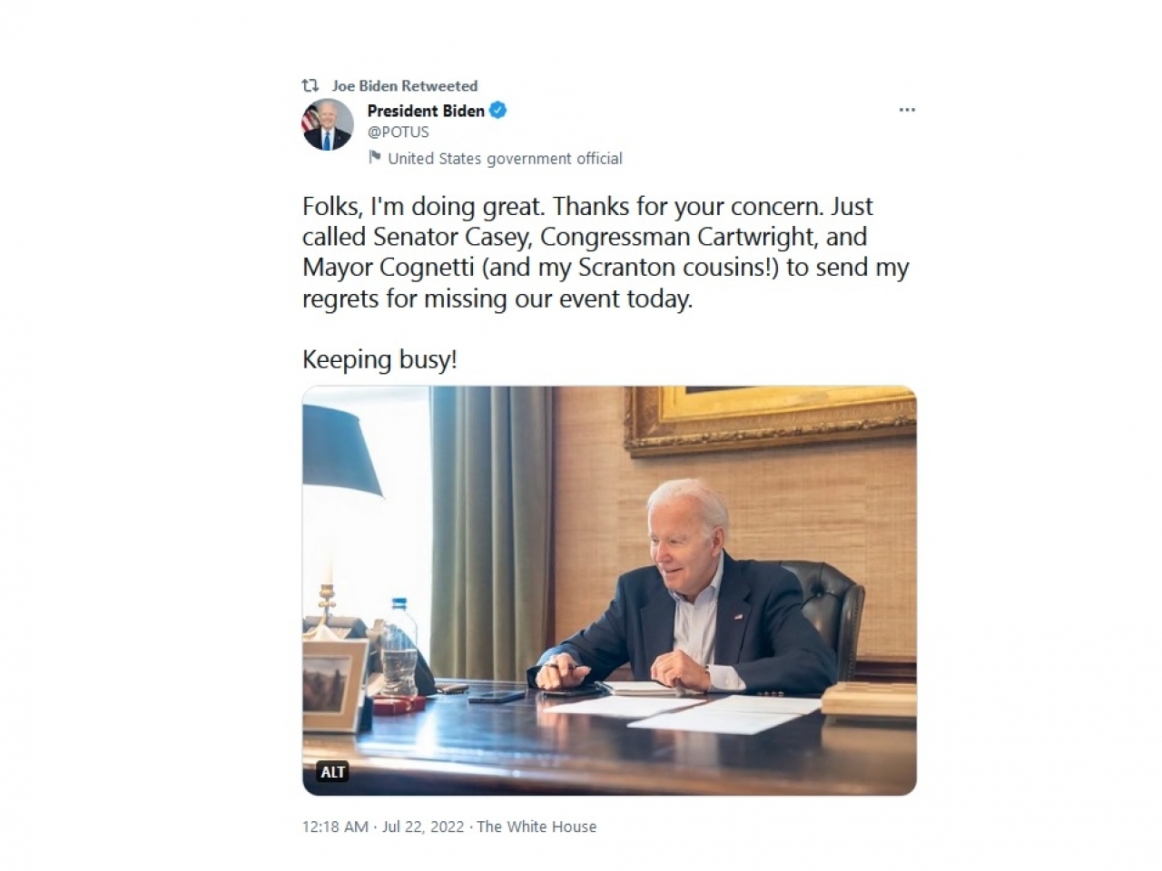 拜登在社交網站上載相片,看到他在寫字枱辦公,面露微笑。他在留言感謝各方的關心,表示自己情況良好,繼續忙碌工作,拜登又對未能出席公開活動,致電參議員凱西、眾議員卡特賴特及斯克蘭頓市長科格內蒂表示抱歉。