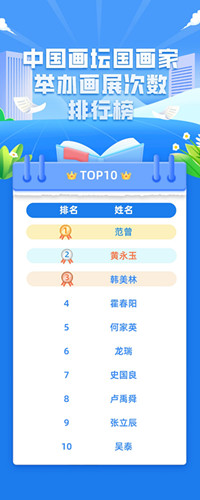 基於此,7月27日,宇祥畫社通過相關數據,深入分析研究,相繼整理出中國畫壇國畫家舉辦畫展次數排行榜top10。這份鮮活數據對比的排行榜,是國畫家不斷奮發努力超越自我的明鏡,也是印證了中國畫壇界人才輩出出,前程似錦。
