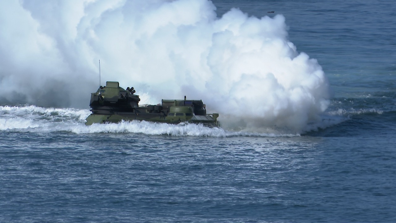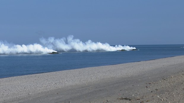 臺灣漢光演習第四天進行重頭戲“海空聯合登陸作戰”,在南臺灣屏東登場,國軍採攻擊態勢,出動無人機、IDF戰機,及21艘兩棲突擊車編成4波突擊舟波,進攻灘岸,實彈操演。由於俄烏局勢及兩岸關係緊張,吸引許多外媒和國內外軍事迷到訪,也有民衆從外地前往觀看,臺灣國防受到更多關注。