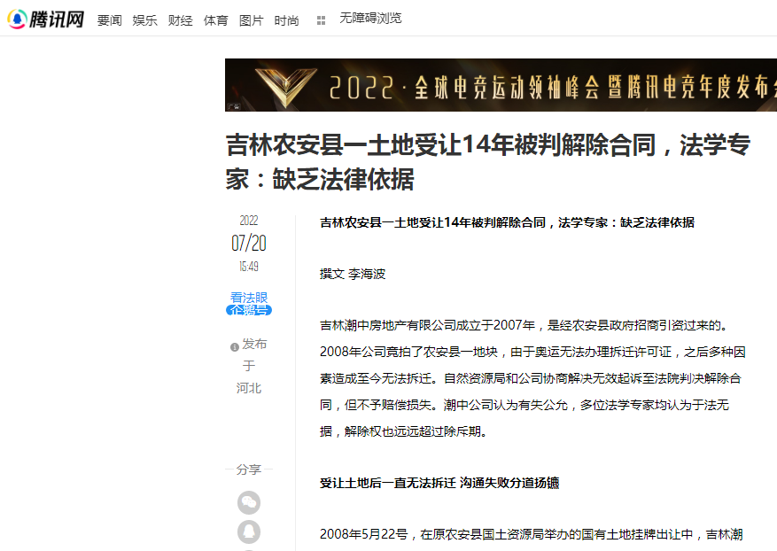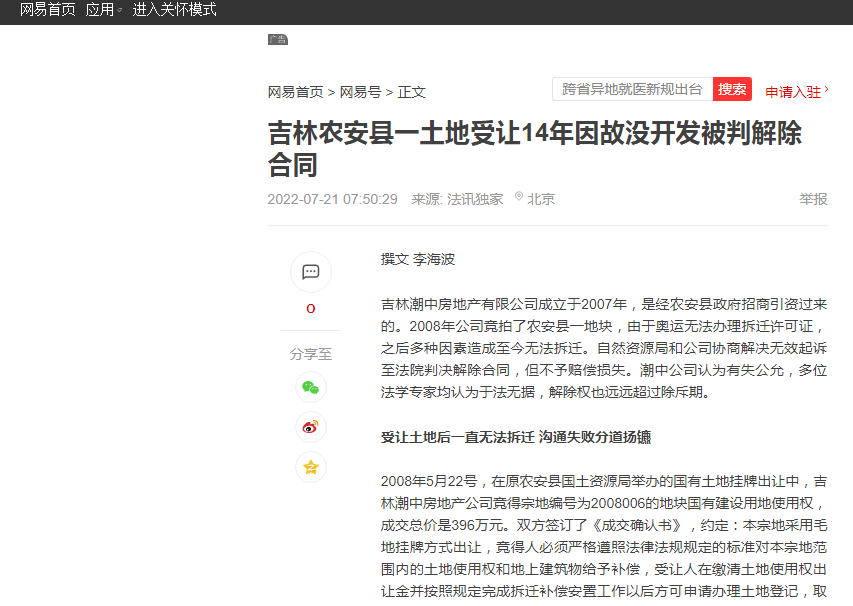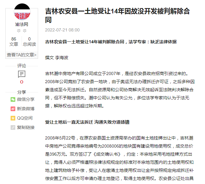 吉林省农安县法院就农安县自然资源局起诉吉林潮中房地产开发有限公司国有建设用地使用权合同纠纷一案已作出一审判决:解除合同。关于此14年轮回未决的案件,给了人们一个东北投资的历史回眸,看部分网络媒体展开了报道,链接截图如下: