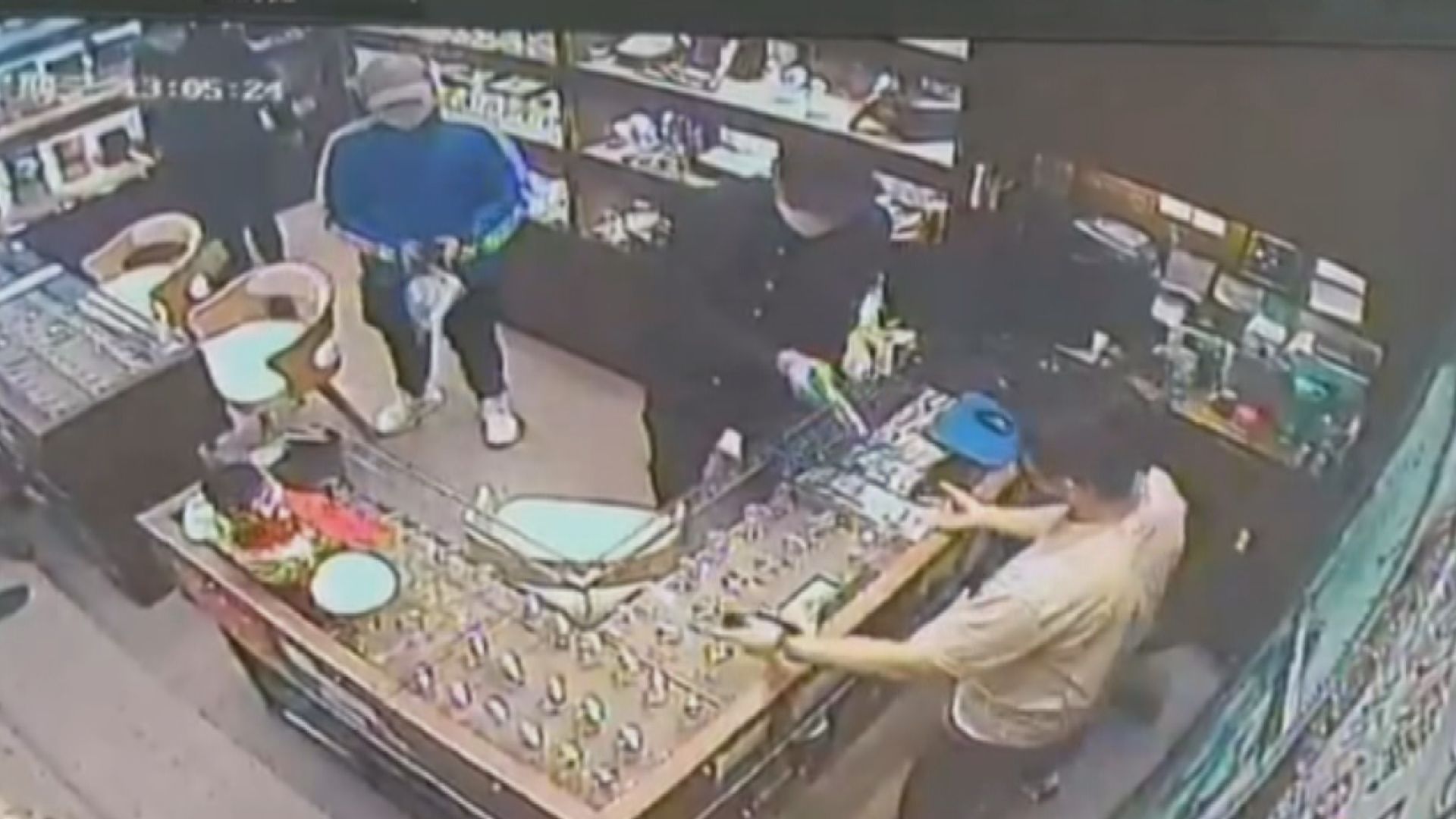 其中一名穿黑衣、戴黑帽男子拿出一支懷疑手槍指向兩名店員;另一名穿藍衣的男子則手持一把長刀指向女店員;另有一名同穿黑衣手持黑色手提袋的男子,與第四名懷疑賊人入內。